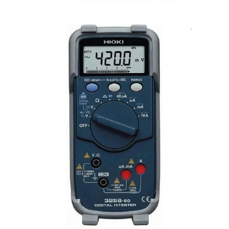 مولتیمتر دیجیتال هیوکی 3256-50 یکی از پرفروشترین مولتیمتر هیوکی ژاپن است که با توجه به مشخصات فنی برای کاربرد تعمیرات برد الکترونیک ، تشخیص قطعات الکترونیک و موارد مشابه استفاده گستردهای در صنعت برق دارد. از ویژگیهای این دستگاه میتوان به اندازهگیری ولتاژ، اندازه گیری فرکانس، مقاومت، تست دیود به صورت رنج خودکاراشاره کرد. این دستگاه دارای ابعاد جمعوجور و وزنی سبک است. منبع تغذیه مولتیمتر دیجیتال هیوکی 3256-50 باتری است و قابلیت اندازهگیری ولتاژ تا ۱۰۰۰ ولت را دارا است. این محصول دارای رنج مجزا برای اندازهگیری میکرو آمپر، میلیآمپر و آمپر است. گفتنی است اندازهگیری آن تا ۱۰ آمپر و مقاومت تا ۴۲ مگا اهم است. مولتیمتر دیجیتال هیوکی 3256-50 ذارای امکان تست دیود بوده و یکی از امکانات دیگر آن امکان تست اتصال کوتاه است. مولتیمتر دیجیتال هیوکی 3256-50 قابلیت اندازهگیری فرکانس را داشته و دارای رنج خودکار است.