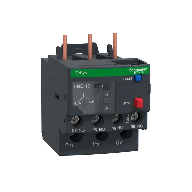 بیمتال اشنایدر LRD10، رله حرارتی TeSys LRD اضافه بار 6 آمپر 690 ولت AC/DC است که در محدوده تنظیم جریان حرارتی 4-6 آمپر با کلاس تریپ 10 برای حفاظت از موتورهای 3 فاز 2.2 کیلووات در 400 ولت استفاده میشود. این محصول را میتوان در شبکههای تا فرکانس 400 هرتز استفاده کرد. بی متال اشنایدر مجهز به سیستم تشخیص قطع فاز میباشد. حساسیت قطع فاز در این بیمتال برابر با 130 درصد Ir در دو فاز و در فاز دیگر برابر با 0 و آستانه عملکرد و قطع این بیمتال برای اضافه برابر با 1.14 جریان نامی با 0.06 اختلاف است