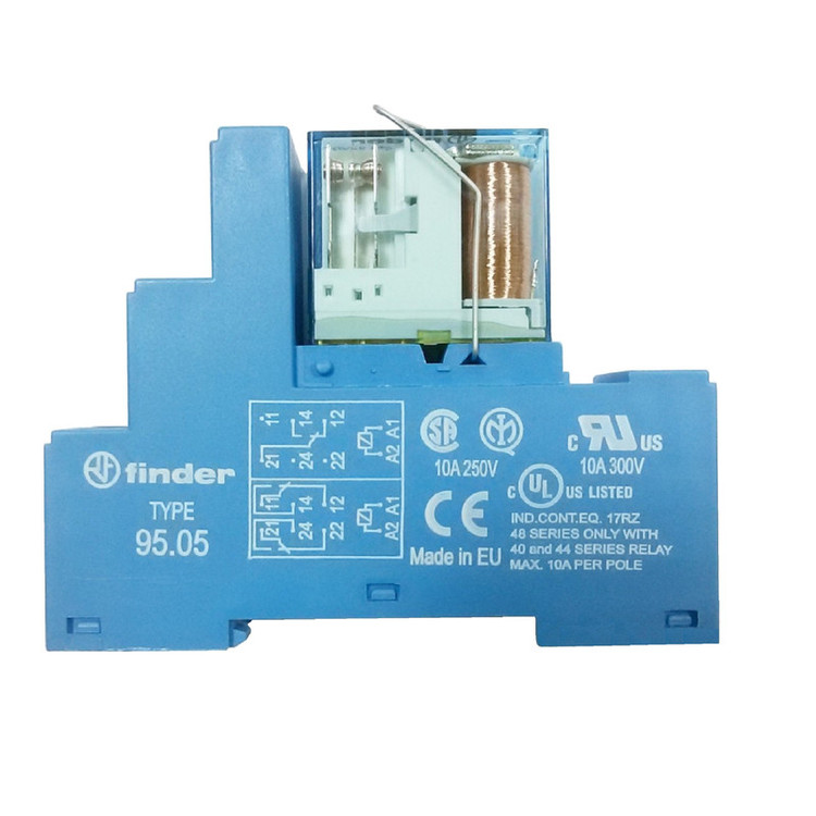 رله شیشه ای / رله کمکی فیندر تجهیزی هستند مشابه کنتاکتور، یک بوبین و تعدادی کنتاکت دارند و با برق دار شدن بوبین کنتاکت ها تحریک شده و تغییر وضعیت می دهند . لذا در حالت کلی عملکردی مشابه کنتاکتور دارند . از رله شیشه ای برای قطع و وصل بارهای کوچک در مدارهای فرمان استفاده می شود . از ویژگی های این نوع رله ها ارزانی ، کوچکی و طول عمر بالاست . ساخت این وسیله در انواع با تنوع ولتاژی و تعداد مختلف پلاتین مدل های مختلف را جهت استفاده عرضه می نماید . رله های الکترو مکانیکی در دو مدل قابل نصب روی برد و قابل نصب روی سوکت تولید می گردند که در تابلو برق های صنعتی بیشتر از نوع قابل نصب روی سوکت (پایه رله ) استفاده می گردد . نحوه سیم بندی سوکت پایه رله بر روی خود آن مشخص شده است. ولتاژ بوبین رله مذکور 24VDC و ساخت اروپا می باشد.