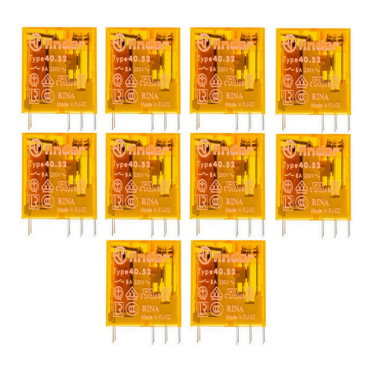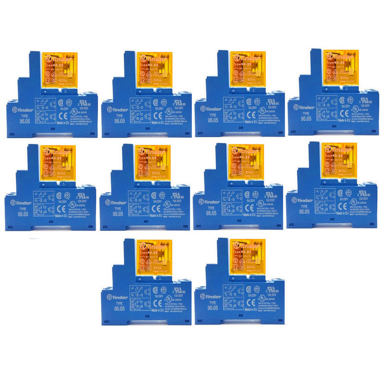 این کالا شامل ده عدد رله 40.52 به همراه ده عدد سوکت 95.05 ارائه می شود . رله فیندر 40.52.9.024 یک نوع رله مینیاتوری 8 آمپر، با ولتاژ بوبین 230 ولت AC است. این رله 8 پایه دارد و دارای 2 کنتاکت است و از طریق سوکت 9505 روی ریل مینیاتوری و داخل تابلو نصب می شود این رله ساخت فیندر ایتالیا می باشد