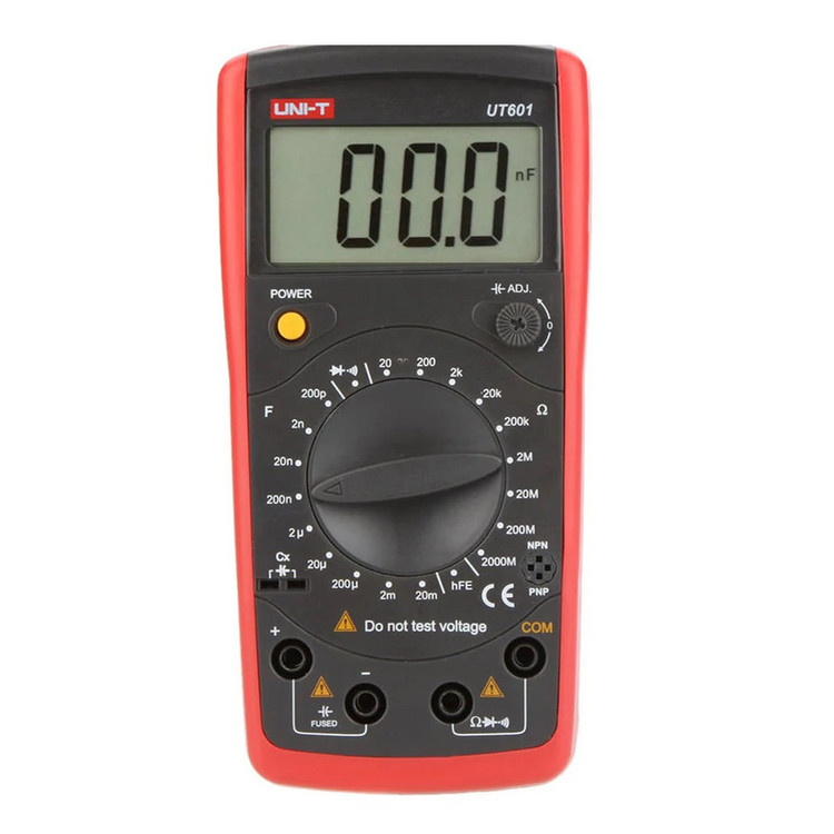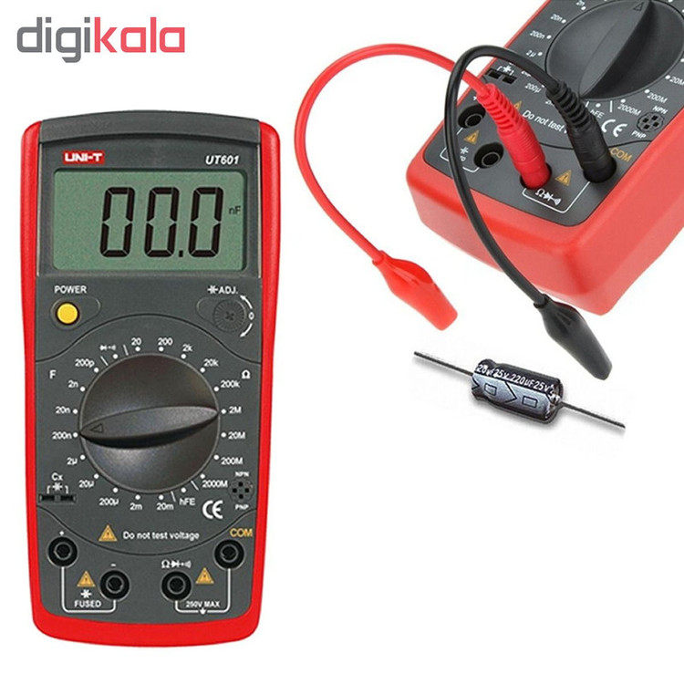 دستگاه خازن سنج برند UNI-T مدل UT201 برای اندازه گیری میزان ظرفیت خازن و مقدار مقاومت طراحی شده است .این خازن سنج از رنج پیکو فاراد تا 20 میلی فاراد و اهم مقاومت تا 2000 مگا اهم را اندازه گیری می کند .از دیگر امکانات دستگاه می توان به سوکت اتصال ترانزیستور برای اندازه گیری hFE ، سوکت مخصوص اتصال خازن ، تست دیود و تست اتصال کوتاه اشاره کرد . ولوم تنظیم دقیق نیز بر روی دستگاه نصب شده که دقت اندازه گیری را بیشتر و خطا اندازه گیری را صفر می کند.