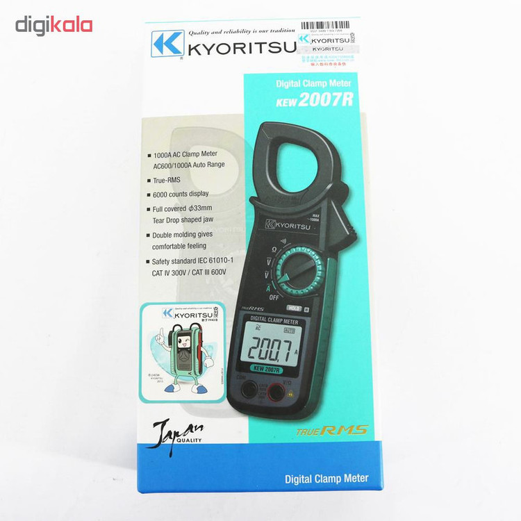 شرکت «کیوریتسو» (Kyoritsu) از تولیدکنندگان نامآشنا دستگاههای اندازهگیری به شمار میآید. این شرکت مدلهای مختلف دستی و رومیزی مولتیمتر را تولید و به بازار عرضه کرده است. مدل 2007R یکی از محصولات تولیدشده توسط شرکت کیوریتسو بهحساب میآید. این مدل، مولتیمتر « کلمپ» (Clamp) بسیار مناسبی است که قابلیت استفاده با پراب هم در آن وجود دارد. کلمپی یا انبری بودن این مدل باعث میشود که تنها با استفاده از یک دست بتوان جریان سیم موردنظر را اندازه گرفت. با این دستگاه فقط ولتاژ و جریان AC را میتوان اندازهگیری کنید. دامنهی ولتاژ اندازهگیری با این دستگاه از 400 تا 600 ولت تعیین شده است. و 1000 آمپر، دامنهی جریانی است که با این مولتیمتر میتوان اندازهگیری کرد. حداکثر قطر سیم یا کابلی که میتوان با استفاده از انبر این دستگاه مورد اندازهگیری قرار داد 33 میلیمتر است. مولتیمتر مدل 2007R، دارای 220 گرم وزن و ابعاد 36*81*204 میلیمتر است که حمل آن را برای شما آسانتر میکند. نکته مهم اینکه دقت اندازه گیری این دستگاه TRUE RMS میباشد .