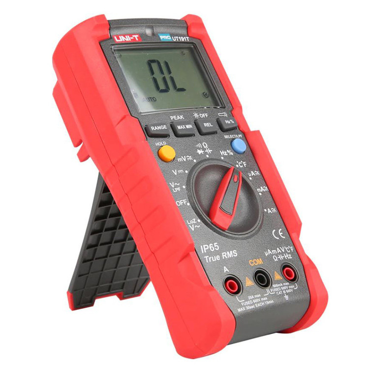 مولتی متر حرفه ای یونیتی مدل UNI-T UT191T یک مولتی متر حرفه ای است که برای کاربران صنعتی طراحی شده است. این سری از مولتی متر های برند یونیتی با گواهی های حفاظتی متعدد CE / GS / cTUVus با CAT III 600V ارائه شده و مطابق با استاندارد حفاظتی IP65 مناسب برای استفاده در محیط های مرطوب و پر گرد و غبار می باشد. مولتیمتر دیجیتال مدل UNI-T UT191T با عملکرد جدید در بخش حافظه داخلی قادر است آخرین حالت تنظیمات بر روی دستگاه را در روشن شدن بعدی دستگاه حفظ نموده و سبب بهبود کارایی برای کاربران شود. همچنین این مولتی متر اندازه گیری دقیق دما را نیز پشتیبانی می کند. UT191T از اندازه گیری دقیق دما پشتیبانی می کند.