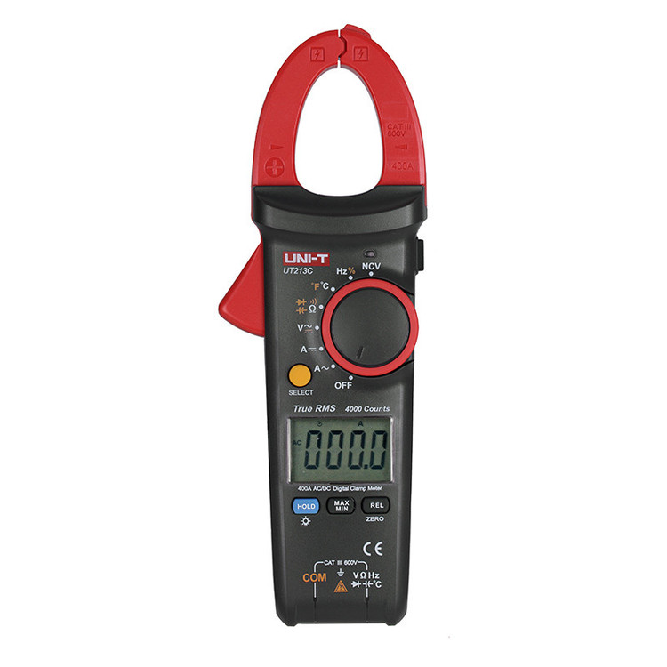 کلمپ آمپرمتر یونیتی مدل UNI-T UT213C با دقت TRUE RMS با کیفیت مناسب و قیمت ارزان به هر دو شکل AC و DC قادر به اندازه گیری شدت آمپر تا 400 آمپر AC با دقت +/- (2.0%+3) است. و همچنین اندازه گیری ولتاژ تا 600 ولت AC /DC با دقت اندازه گیری ولتاژ از +/- (0.8%+5) و اندازه گیری مقاومت تا 40 مگا اهم با دقت +/- (1%+2) و اندازه گیری فرکانس از 10هرتز تا 1 مگا هرتز ، ظرفیت خازن از 50 نانو فاراد تا 40 میلی فاراد ، از مشخصات فنی اندازه گیری کلمپ مولتی متر UNI-T UT-213C می باشد و از ویژگی های تنظیمات دستگاه که کاربر با تنظیم میزان ولوم دستگاه میتواند در این بازه میزان شدت جریان و ولتاژ عبوری کابل را اندازه گیری کرده و دقت لازم را در کار اعمال کند. کلمپ آمپر متر 400 آمپر AC و DC اتورنج دیجیتال UNI-T UT 213C از نظر دارا بودن قابلیت های مختلف منحصر به فرد بوده و میتواند دما را به کمک پروب ترموکوپل تا 1000 درجه اندازه گیری کند. این ویژگی ها سبب میشود این کلمپ آمپر متر در زمینه تهویه مطبوع ( HVAC ) و کلیه تست های روزانه برقکاران و تکنسین های برق کاربرد داشته باشد. این کلمپ آمپر متر اتورنج بوده و یکی دیگر از قابلیت های خوب آن ، ردیابی سیم های برق دار است. دهانه کلمپ 30 میلیی متر بوده و دارای نمایشگر با نور پس زمینه ، اندازه گیری مقادیر مینیمم و ماکزیمم ، تست دیود و تست پیوستگی ( بیزر ) است.در کنار دستگاه چراغ قوه نیز تعبیه شده است تا در مکان های تاریک بتوان به درستی سیم مورد نظر را کلمپ کنید.