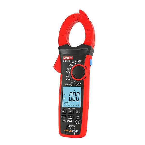 آمپرمتر کلمپی 1000 آمپر AC و دما یونیتی UNI-T UT206B برند یونیتی از جمله مولتی مترهای True RMS دقیق و با کاربردهای متعدد و قابلیت اندازه گیری دما می شود. این دستگاه از برند یونیتی از نوع دیجیتال می باشد که اندازه گیری دقیق و سریع جریان با ویژگی True RMS ، ولتاژ ، مقاومت ، ظرفیت خازنی ، دما و انجام تست پیوستگی و دیود طراحی شده است. صفحه نمایش 6000 رقمی به کار رفته در این دستگاه از نوع LCD با نور پس زمینه و سرعت رفرش سریع سه بار در ثانیه می باشد که با داشتن نور پس زمینه موجب سهولت کار در محیط های کم نور و تاریک می شود. ویژگی برجسته این آمپرمتر قابلیت اندازه گیری دما از 40- تا 1000 درجه سلسیوس با رزولوشن 0.1 °C می باشد. با استفاده از آمپرمتر کلمپی 1000 آمپر AC و دما یونیتی UNI-T UT206B می توان جریان AC را تا 1000 آمپر ؛ جریان هجومی را تا 1000 آمپر ؛ ولتاژ AC/DC را تا 1000 ولت ؛ مقاومت را تا 60 مگا اهم ؛ خازن را تا 60 میلی فاراد ؛ و دوره کاری Duty Cycle را تا 90 درصد اندازه گیری کرد. از جمله ویژگی های مهم این دستگاه قابلیت ثابت نگه داشتن مقادیر اندازه گیری شده روی نمایشگر با استفاده از ویژگی DATA HOLD ؛ حالت LoZ جهت حذف ولتاژ گوست (ولتاژ پنهان یا بسیار ضعیف) ؛ فیلتر پایین گذر LPF جهت اندازه گیری ولتاژ VFD و INV ؛ رنج دستی و خودکار Auto/Manual range ؛ قطر دهانه کلمپ 42 میلی متر ؛ TRUE RMS جهت اندازه گیری ولتاژ و جریان AC متناوب ؛ قابلیت افزایش دامنه اندازه گیری جریان تا 3000 آمپر با استفاده از پراب مجزا ؛ نمایشگر 6000 رقمی همراه با نور پس زمینه ؛ نشانگر کاهش باتری و خاموشی خودکار دستگاه و نور پس زمینه جهت صرفه جویی در میزان مصرف باتری ؛ و چراغ قوه اشاره کرد.