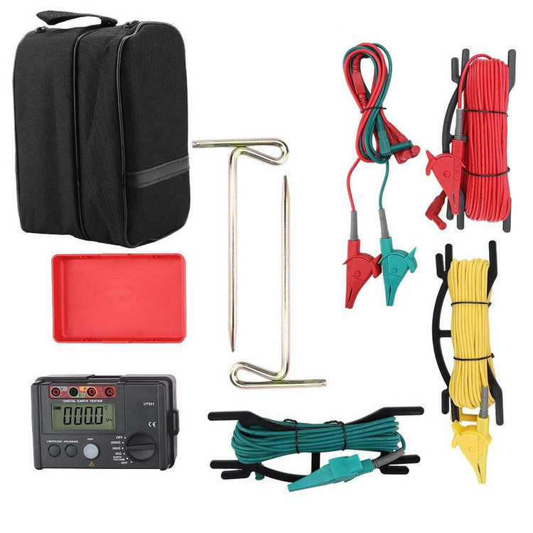 ارت سنج میله ای یونیتی مدل UNI-T UT521 ارت سنج و یا تستر مقاومت چاه ارت ساخت کمپانی یونیتی UNI-T با کیفیت مطلوب و قیمت مناسب و ارزان می تواند به روش های سه سیمه و دو سیمه میزان مقاومت زمین را اندازه گیری کند بعلاوه اینکه این ارت سنج علاوه بر قابلیت اندازه گیری مقاومت میزان ولتاژ زمین را نیز اندازه گیری می کند. ارت سنج میله ای یونیتی مدل UNI-T UT521 دارای سلکتور دستی برای مشخص کردن رنج مقاومت اندازه گری و همچنین اندازه گیری ولتاژ زمین است. قابلیت اندازه گیری مقاومت زمین تا 2 کیلو اهم و اندازه گیری ولتاژ AC زمین از 0 تا 200 ولت در فرکانس 50 تا 60 هرتز و نمایشگر بزرگ به همراه نور پس زمینه از مهمترین ویژگی های این ارت سنج است